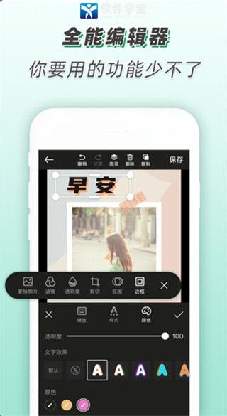 「编辑功能强大」:支持新建画板设计,多种花字特效 ,众多图文组合样式,支持图片的多种边框和滤镜效果处理。