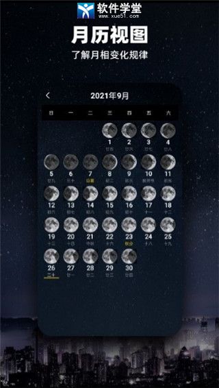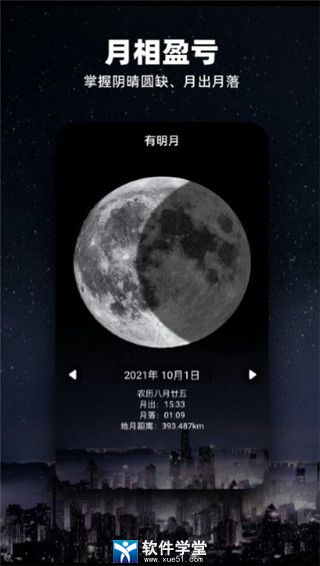 1、还有月相农历日历,圆缺变化,月相名称,月亮升起落下的时间,地月距离等信息。