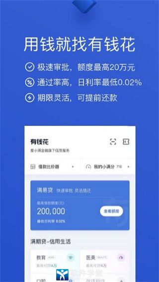 有钱花是一款实用的小额借贷软件。如果你有资金短缺的困扰就来看看这款软件吧,这款软件功能非常强大,操作也很简单,用户只需要填写身份证信息就能款获得借款额度,最高额度可达20万元,还款方式也非常的灵活,为用户提供了方便、快捷、安心的借款服务。今天小编为大家带来了