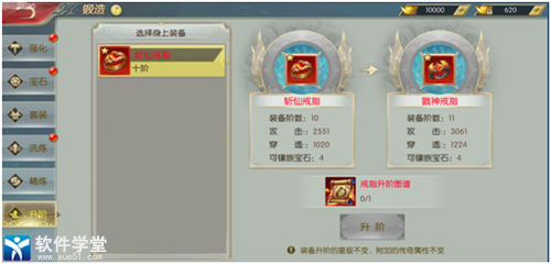 3、升阶可大幅提升装备的基础属性,只可对穿戴在角色身上的手镯和戒指部位进行升阶。