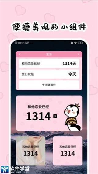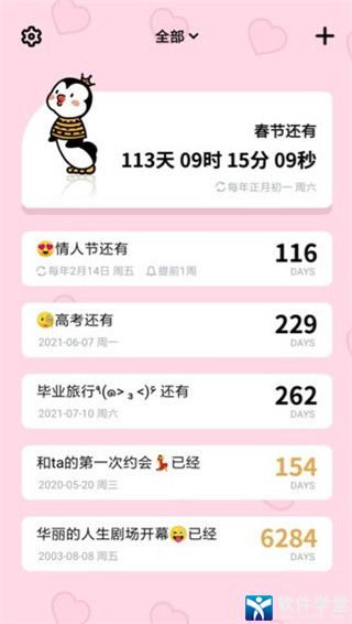 该软件是很受女生用户喜爱的倒计时软件。提供了各种萌萌的皮肤模板,你也将重要的日程一一添加其中,选项喜欢的模板使用。无论是学生族还是上班族都可以用哦,让你不错过一场考试、一次约会、一个重要会议安排等等,是一款帮你记录生活中重要日子的倒计时app,功能包含倒数日、正数日、记录纪念日、生日、传统节日等各种你关心的日子并及时提醒你,大家可以使用软件来进行一些重要日子和事项的记录,能够让你在这里更轻松的记录美好,软件内拥有非常多的主题可以切换,备忘录的背景也非常可爱,各种模板可以使用,这里的界面自带各种节日倒数,节气倒数,你可以自己添加各种重要的日子进行倒数,当然,你还可以设置重复的周期,这样就可以更加清楚的知道倒数进行的时间了,在这里,你可以把一定的倒数日期通过插件的方式放在桌面,更加的显眼。赶紧来下载试试吧。