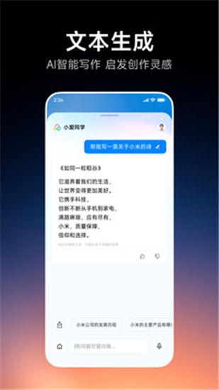 强大的内容创作功能,从文章写作、制定文案,到高情商的智能回复与活动策划,小爱都能成为你的得力创作助手!不仅如此,它还为我们提供了更多高效工具,如PPT大纲助手、代码生成器等等,可帮助你有效提升工作效率,有需要的朋友快来下载使用吧!!