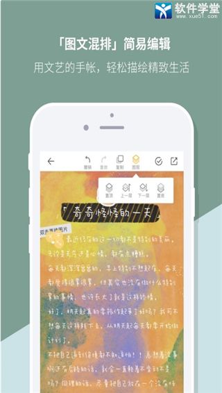 该软件是一款随时随地记录生活方式的文艺范笔记本,由广州得扬网络科技有限公司研发,用心关注用户生活点滴,旨在为用户提供方便快捷的生活记录方式,想要记录生活的美好,我们的记忆中它弥足珍贵,是因为它记录着我们最在意的人、事物还有心情。 但是随着岁月的流逝,我们早已忘记当初珍爱的本子藏在哪个角落,长大了,我们也没有心思去花几天的时间研究怎么排版,怎么填充空白 ,匆匆之中,我们生活的点点滴滴不知何处安放,软件的界面非常清新简洁,它可以帮你记录各种精彩的瞬间,有了它,用户可以将自己所见所闻记录下来,还可以是旅游日记,情感记录,青春纪念手册等等,只要你想记录就可以记录。而且,软件功能也十分强大,提供手绘贴纸、胶带画笔、软萌字体、多彩背景等多样式玩法,拥有各种记账或者记录事项的模板,并且软件内置各种颜色的手写笔工具,可以非常方便的帮助用户进行批注,非常人性化。