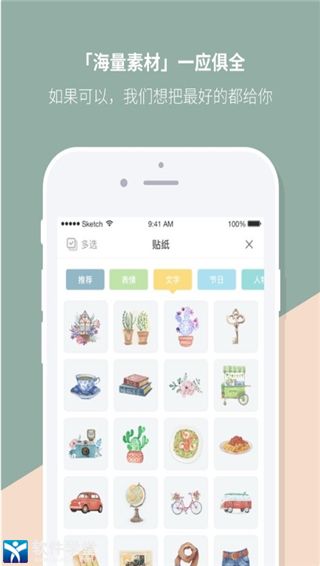 1、选取贴纸:手帐上的贴纸可任意选取并缩调整大小,装饰笔记。