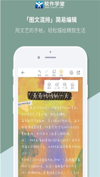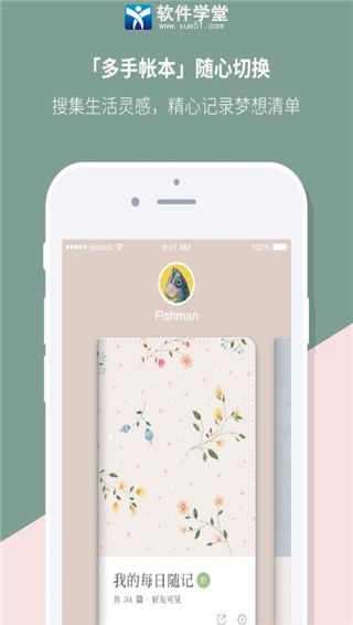 该软件是一款非常实用的手机记事笔记类应用,这款软件设计的非常小巧精致,有公开私密两种模式,可以随意切换,通过它记录生活中的点点滴滴,分享生活中美好的瞬间,拥有与年轻人的精致生活很搭调的小清新风格界面,随时随地记录生活的点点滴滴,图文编辑+海量素材,图文拼贴的乐趣妙不可言,用它们编排制作出精美的日记,帮你留住了美好的时光,热爱交流的年轻人一定也会喜欢这里的手账社区,妙趣横生的话题,兴趣一致的好友,以手帐会友,你们可以聊得更嗨,我们或许都有过这么一个写满各种笔迹,粘着有趣贴纸的小本子,小清新的花样笔记本,随时随地记录生活与你的小确幸。原创文艺手帐模板随便用,海量手绘精美素材随便贴,把最好的都给你,搜集生活灵感,精心记录梦想清单,用文艺的手账,轻松描绘精致生活,拥有海量素材,不需要费时的步骤,想用随时打开。