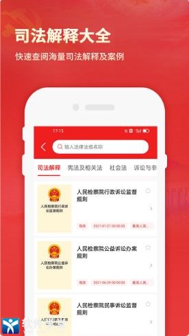 5、法律法规详细分类,一键查找。包含最高法颁布的全部法律法规大全及司法解释,能够方便地查阅相关的法律法规数据库中司法解释及案例。