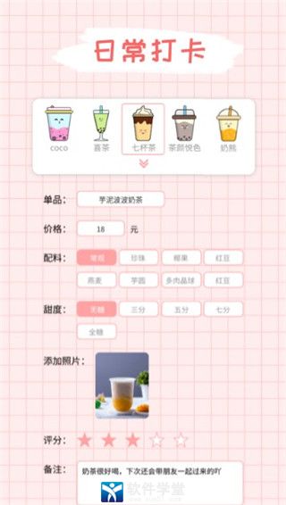 2、在这里你将和所有的奶茶爱好者一起打卡记录评测分享每一杯奶茶。