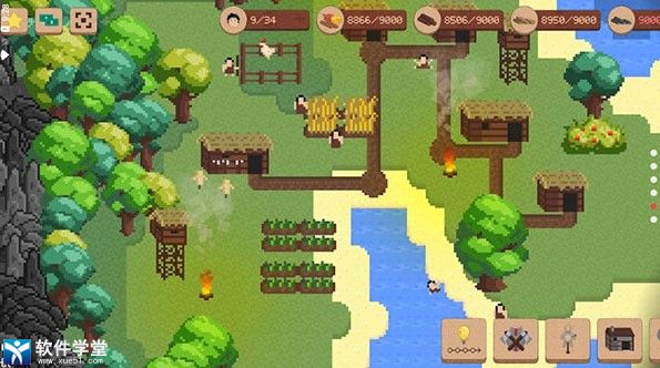 1、像素风格,融合模拟经营和策略战争,必须通过收集资源,扩大村庄规模,保护它免受不同时代的敌人攻击,推进文明。