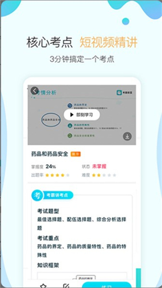 新增特色短视频模块,专业内容研发人员根据历年考试命题规律,打磨出最核心考点,并针对考题赋予独到的解析思路。名师讲解,3分钟就搞定一个考点!