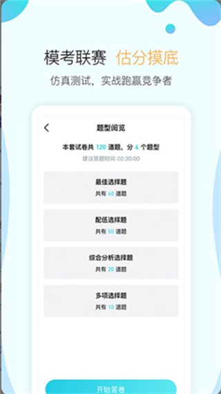 完美模拟实战。时间控制,成绩排名,试题解析,让你轻松过渡实战,把握考试节奏hold住全场。