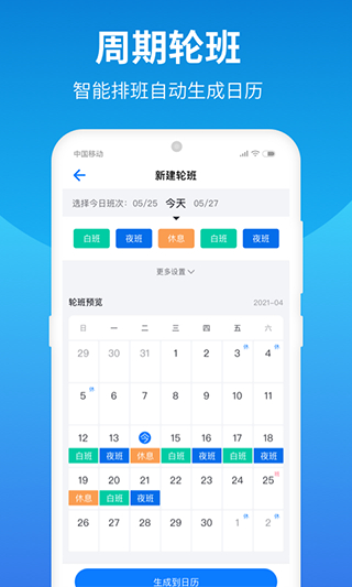 2、周期轮班自动排班,根据您的轮班周期,自动生成一年排班计划。