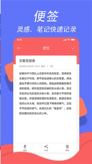 支持文本创建、语音识别输入,您可以通过便签记录下您每天的心情和想法,简单的操作,轻快的设计,你一定会喜欢。
