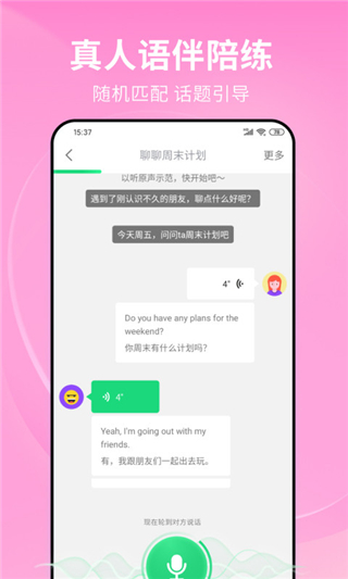 真人在线对话:根据等级匹配合适的语伴,展开英语互动对话;答题pk:连线小伙伴比拼单词量和英语知识。