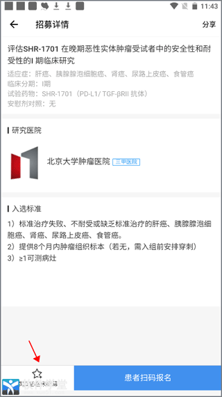 4、就能够看到这项临床试验的具体信息以及患者入选标准,点击左下角的“添加至临床招募”就可以了。
