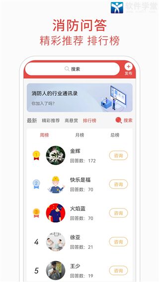 软件以问答形式呈现,最终实现消防知识的共享,主要有“问题分类、推荐问题、待解决问题、会员排行”这几个频道。