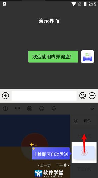 2、然后打开键盘,按键进行下拉即可从词包中抽取聊天回复语句。