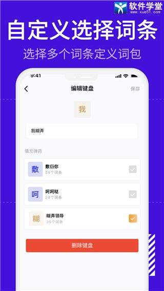 糊弄键盘app是一款非常好玩又有趣的消息快捷回复键盘软件工具,它可帮助各位用户在不方便回复消息时可以自动帮助你迅速提取适宜的关键词发送。且用户还可以设置好延时,能够让你在收到信息的几秒钟之后再进行回复,并提供非常正常的回复内容,不会让对方觉得你是在敷衍,不管什么样的信息都可以回复,非常的方便。此外,该软件还为用户们提供了多种多样种类的词条安装,大家要根据自己的需求自由选择安装。装好的关键词条还可支持用户实现随机抽取,迅速提取适宜的关键词发送。同时软件还有非常敷衍的盲盒式抽取语录回复功能,可以帮助用户随机回复消息,让你的回答答非所问,让回话的人满脸疑惑,敷衍式的回答可以迅速结束必须回复却又无意义的聊天对话。不仅如此,糊弄键盘软件还可支持用户进行多个词条的自定义设置,自定义选择词条回复消息,让你能够轻松应对各个聊天场景,使你的聊天对话更加的轻松。