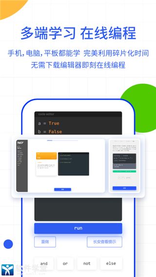 编程软件界面简洁美观,使用操作简单易用,还可支持电脑、手机进度同步,能够自动帮助你保存学习进度,从入门到应用只需要按照课程来,即可轻松帮助新手小白一步步学会编程,快速全面掌握基础语法。