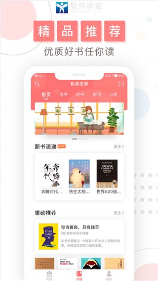 1、书城中的首页栏设置不同推荐书籍窗口,在该页面中对推荐出来的几本书籍一目了然。