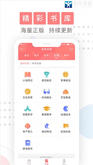 6、还划分了书城中不同内容栏目,其中包括图书、听书以及分类和期刊栏。