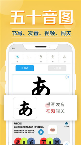- 每个假名都由专业声优录制发音,开发专业书写顺序,以及每个假名关联词记忆法,另外老师对每个假名都录制了视频讲解,包括发音口型、书写顺序、记忆法等,加深用户对假名的理解。为了巩固假名记忆,开发了五十音图闯关功能,使用户能更扎实掌握五十音,让日语入门更简单。