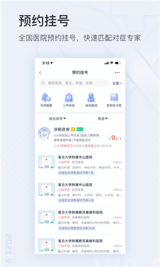2、预约挂号:挂号摆脱排队烦恼。连接了覆盖全国27个省份数千家三甲医院的挂号资源,用户登录,按照症状查找专家医生,轻松实现预约挂号;