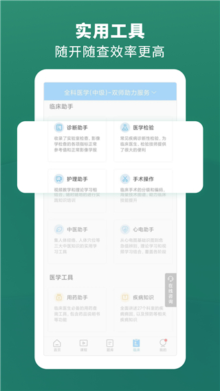 章节练习、模拟考场、错题笔记、考试指南等多功能助力复习,更有多种类临床助手及医学小工具随开随用,日常巩固更便捷