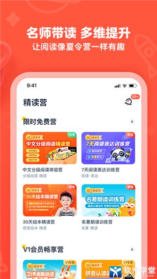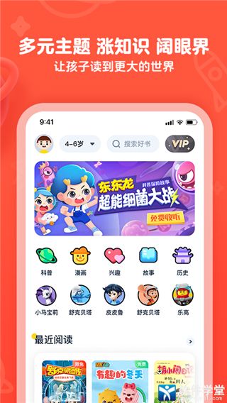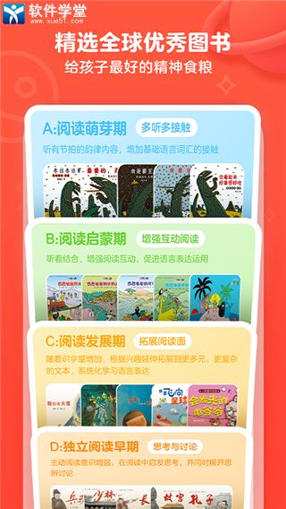 3、儿童分级阅读:采用专业分级阅读体系,从A~E阶带领孩子从阅读启蒙到独立阅读,培养终身阅读习惯。