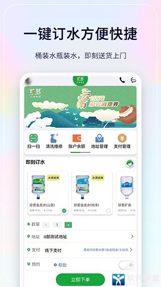 2、一键订水方便快捷,瓶装水桶装水即刻送货上门。