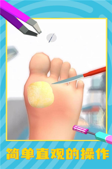 2、游戏玩法采用了时下流行的模拟体验方式,玩家在游戏中借助各种工具,对病人足底的各种疾患进行治疗,或是清除死皮、或是夹出尖刺、或是修剪毛发、或是美足护肤,从最基础的清理开始做起,从关卡中获取收益,开启更多的专业工具,再借助工具的开启,逐渐提供更加专业、高深的足底服务,获取更大的资金,逐步装饰自己的诊所,最终将诊所打造成令人梦寐以求的知名诊所。