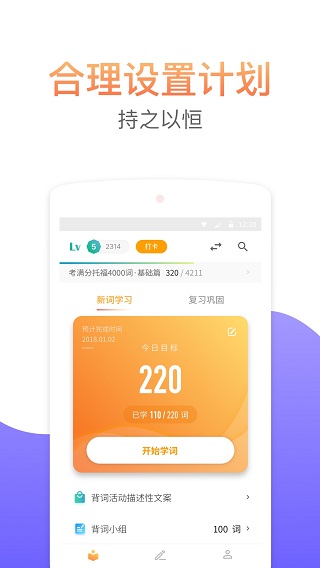 英语学习软件,词汇是学习英语的基础要点,该款软件收录了大量的托福词汇,单词的发音拥有英美两种模式,还有超多科学有效的单词记忆技巧,是托福考生必备的单词软件,让用户能够轻松地背单词。用户可以在这里制定一个学习目标,它便会帮助用户智能化合理的定制一个属于你自己的学习计划,帮助你随时随地都能科学学习。并且根据由于使用的场景模式对话词汇进行分类,方便用户根据自己需求进行选择学习,有需要的小伙伴快来下载吧!