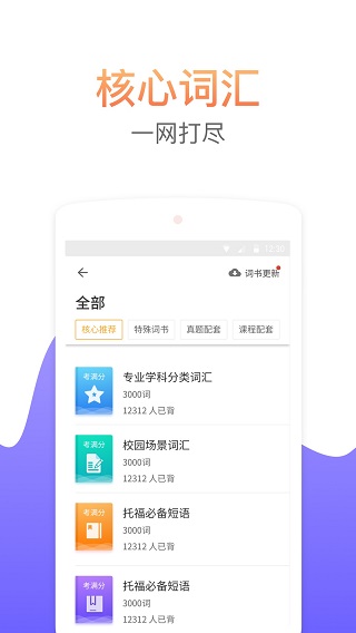 考满分词汇app拥有6000+考点词汇编,基础词、核心词、冲刺词应有尽有, 按考试类型分为学科、校园等多维度场景