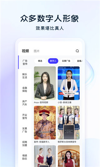 职业男女、阳光帅哥、古风美人、外国友人等众多数字人形象任你选择~数字人形象生动逼真,视频效果堪比真人实拍。还能一键切换视频背景,如替换为直播间、演播厅、销售展厅等场景,让你随心定制自己想要的视频效果。