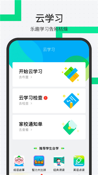 2、在线学习:查看发布作业,推荐优质适龄学习应用。