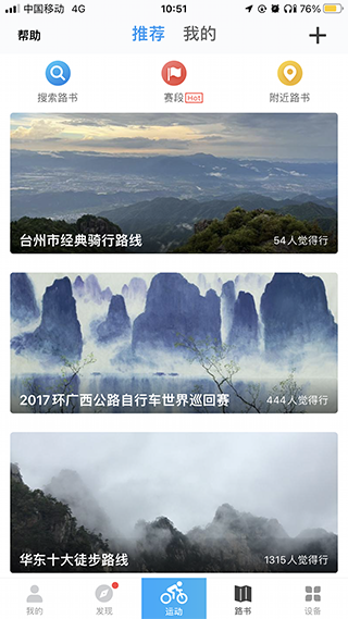用户点击右下角路书,可以查看推荐的骑行运动路线计划,也可以自己搜索想要的路书。