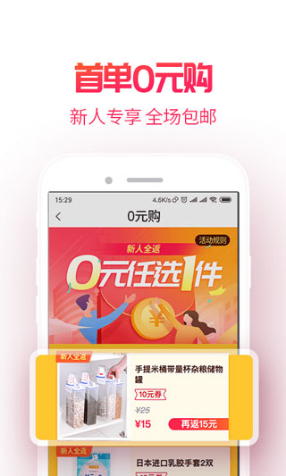 2、0元购:新人专享0元包邮购,全额返利免费送到家