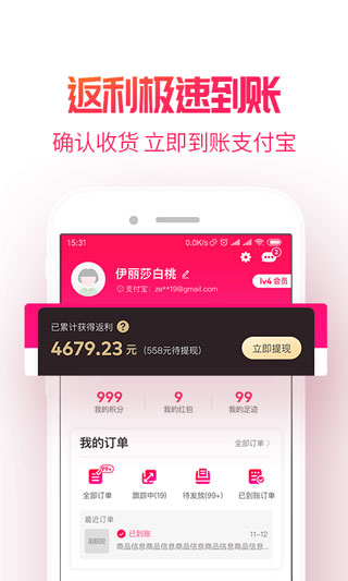 5、返利极速到账,确认收货,立即到账支付宝。