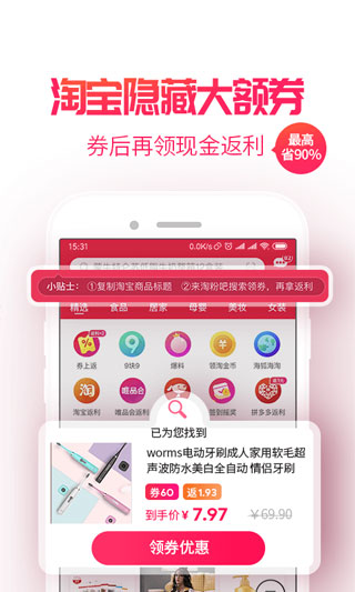 1、淘宝隐藏大额券,券后再领现金返利;