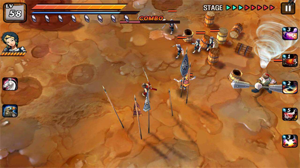 6、技能和换人:放技能只需点击屏幕右边的技能快捷键即可,大部分技能是指向型的,所以点击技能后还需要调整释放的方向。换人也是点击右边的武将头像就行了。需要注意的是,释放技能消耗的并不是蓝条,而是蓝条下面的灵魂石,越是强力的技能消耗的灵魂石越多。