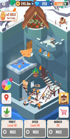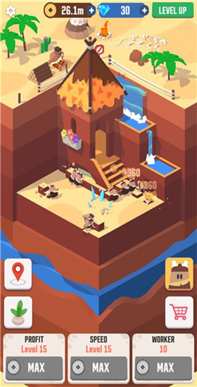 2、独特的升级系统,你可以提升工人的挖掘速度,还能增加人数,让建筑变得更加迅速,赚更多的钱;
