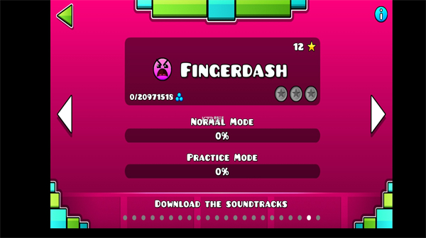 《几何冲刺(Geometry Dash)》是一款由RobTop Games最新推出主打“反应力”的休闲小游戏,玩家点击屏幕帮助我们的几何方块躲避各种机关,并一路前进。是目前最新主打反应力的休闲小游戏,需要玩家有高精确的操作性,还支持DIY关卡,玩家可以自制关卡,分享给你的朋友。这是一次有趣的冒险,会让你忘记时间!这个游戏操作非常简单。新手伙伴一眼就能知道如何操作它。然而,这个过程也非常具有挑战性。如果我们不小心,游戏可能会结束,所以我们每次操作都必须小心!游戏设计有独特的关卡,各种奇葩的怪物,配上优美的音乐带给玩家不一样的全新享受。在游戏中玩家爱需要不断挑战各种关卡进行任务完成。多种模式让你尽情享受其中的快乐体验!几何冲刺丰富的关卡等你来挑战,十分考验玩家的反应能力。