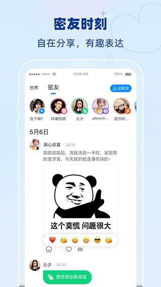 贴贴app是一款非常有意思的全新社交软件应用,软件页面简洁美观,功能丰富多样,可以支持用户分享各种各样的趣味照片,并将其快速传送发送个家人、朋友,更多个性化的恶搞玩法,让你每天的生活都能够丰富多彩!