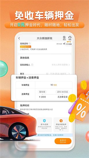 该软件提供了网上预订、电话预定、手机端预定、门店预定等多种预订方式,还有送车上门、地铁口取车、上门取车、异地还车等一系列行业的服务,还提供车损免赔,送乘客座位险,芝麻信用免预授权等,而且在全国多省市内免费异地还车,提供24小时的自驾和预约租车用车服务,用户可以使用它随时随地租车,致力为用户提供最专业优质、便捷高效的服务。