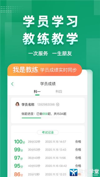 1、考试:学习进度教练随时把握,教练可根据进度组织考试。