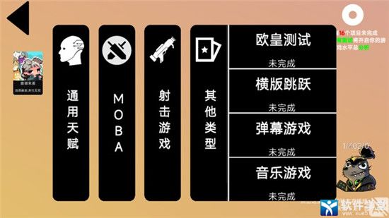 我的游戏天赋正版游戏吧。这是一款集合了多种游戏的一款测试玩家游戏天赋以及水平的游戏,这款游戏可以测试的内容有射击,测试玩家的命中率以及提高玩家的命中率,让玩家可以更快的在枪战游戏中一枪入魂命中目标。MOBA游戏类型内容的测试,考验玩家的走位,并提升走位让玩家练就一手蛇皮走位,在MOBA游戏中走位是想当重要的一个技能,练就一手蛇皮走位在MOBA游戏中一定可以大显身手,轻松对敌。反应测试,提升玩家的反应能力,不管什么游戏玩家的反应能力都是最重要的一环,提升了反应能力,不管玩什么游戏都能更加轻易的上手,并且还能在游戏中大放异彩,最后是欧气测试,顾名思义测试运气的,有句话说的好运气也是实力的一部分,在好的技术在运气面前也是不堪一击,这一项就完全看玩家自己的脸了。以上这些模式玩家都可以选择进行挑战,游戏的难度也会随着时间得到对应的提升,时间越久难度也会也大,对应的游戏结束后也会获得更高的游戏得分,玩家可以在这些模式中反复进行训练,在获得高分的同时提升自己的游戏天赋。总之,我的游戏天赋正版是一款非常有意思的测试和提升游戏天赋的游戏,玩家在不断游玩的过程中也会相对应的游戏水平得到提升。
