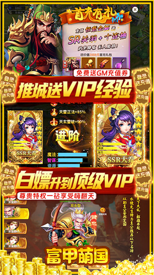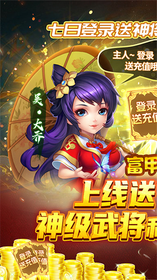 1、这款三国游戏有着精致的画面,游戏中玩家上线就能领取福利,这款游戏玩法丰富,游戏操作简单