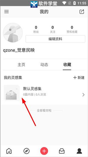 3、打开收藏后,用户可查看创建的灵感集(收藏内容在灵感集里),也可创建新的灵感集,点击默认内容