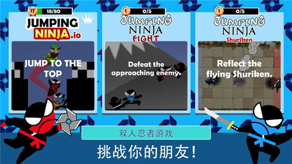 跳跃忍者豪华版中文版游戏玩法比较简单,有多种角色可以选择,不用担心因为角色单一认不出具体的控制人物,总共有三种游戏玩法和朋友使用同一台设备攻击跳跃走位,总的来说这款双人游戏非常有趣,感兴趣的小伙伴可以下载体验一下。