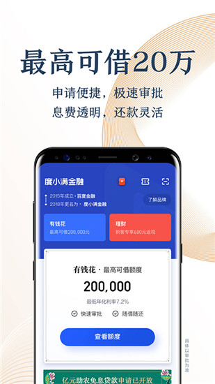 度小满金融app是百度旗下的一款提供多种金融产品和服务的移动应用程序。软件提供了包括个人贷款、信用卡、理财等在内的多种金融产品,满足不同用户的需求。该应用程序操作简单,用户可以方便地进行注册、登录和申请贷款等操作,使得使用体验良好。严格控制贷款用户的风险,采取多种安全措施,保障用户的信息安全和资金安全。该应用程序采用积分制度,用户可以通过参与活动、消费等方式获得积分,在积分兑换商城中兑换礼品。除了基本的金融借贷服务平台还为用户提供保险、支付、理财等多种实用功能。