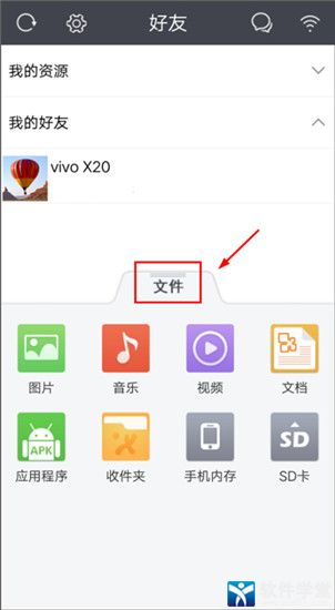 1、下载打开应用程序,在首页点击下方的【文件】,在这里选择选择需要传输的文件
